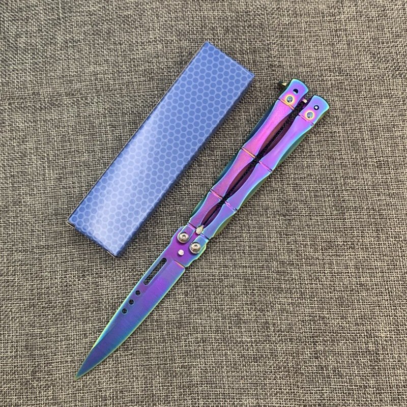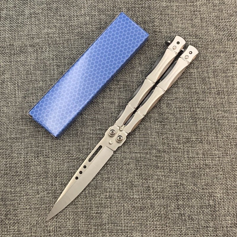 Total length: 255mm (10 inches) Blade length: 110mm (4.33 inches) Handle: 145mm (5.70 inches) Blade thickness: 3mm (0.118 inches) Blade width: 26.8mm (1.05 inches) Handle thickness: 12.6mm (0.49 inches) Hardness: 56-58HRC Blade material: 440 Handle material: Integrated aviation aluminum 6061-T6 System: Shaft sleeve Net weight: 109gV4 Butterfly 6061 Aluminum Bright Slot Training Balisong Knife