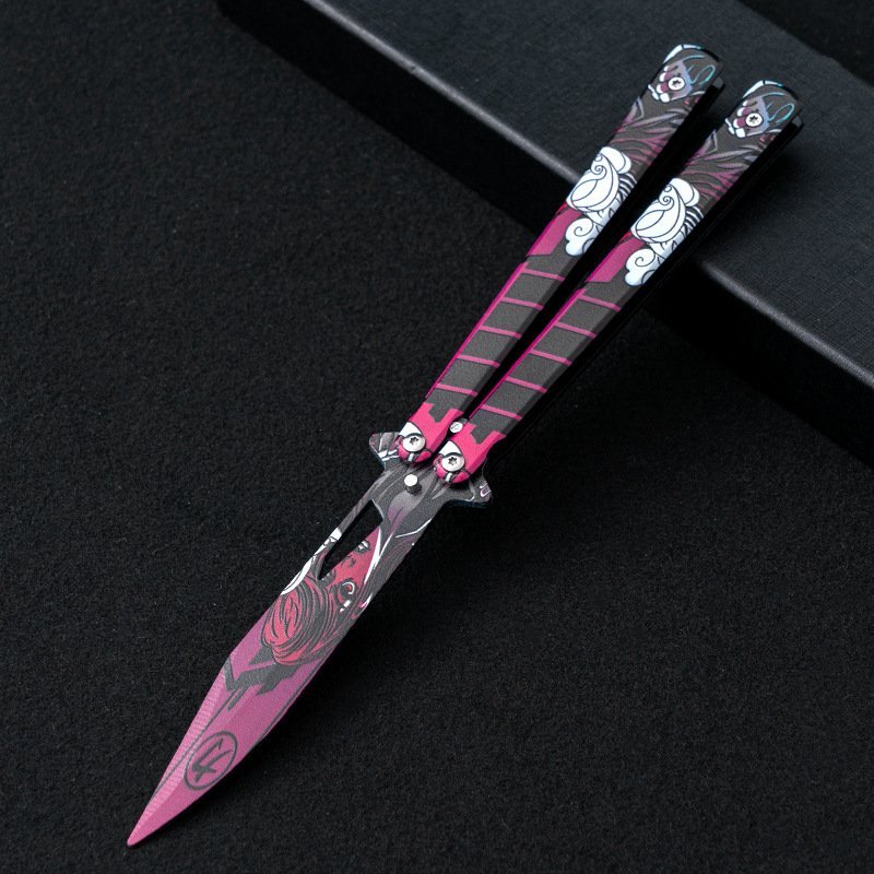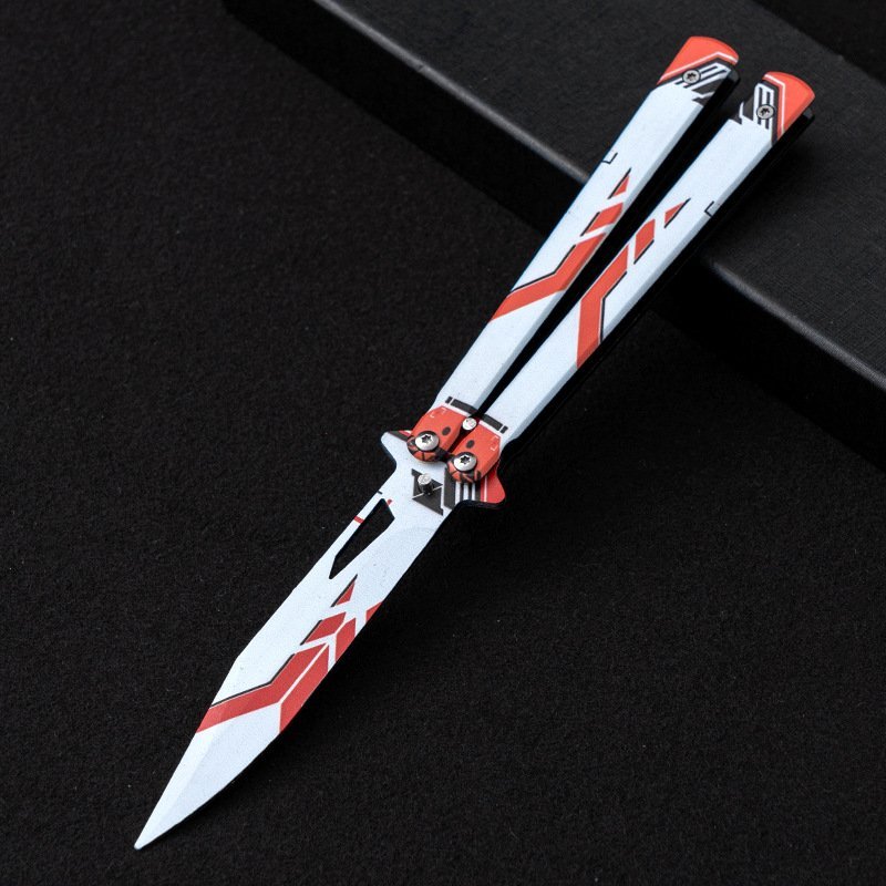 Total length: 255mm (10 inches) Blade length: 110mm (4.33 inches) Handle: 145mm (5.70 inches) Blade thickness: 3mm (0.118 inches) Blade width: 26.8mm (1.05 inches) Handle thickness: 12.6mm (0.49 inches) Hardness: 56-58HRC Blade material: 440 Handle material: Integrated aviation aluminum 6061-T6 System: Bushing Net weight: 110gAluminum handle integrated CSGO peripheral Butterfly Trainer
